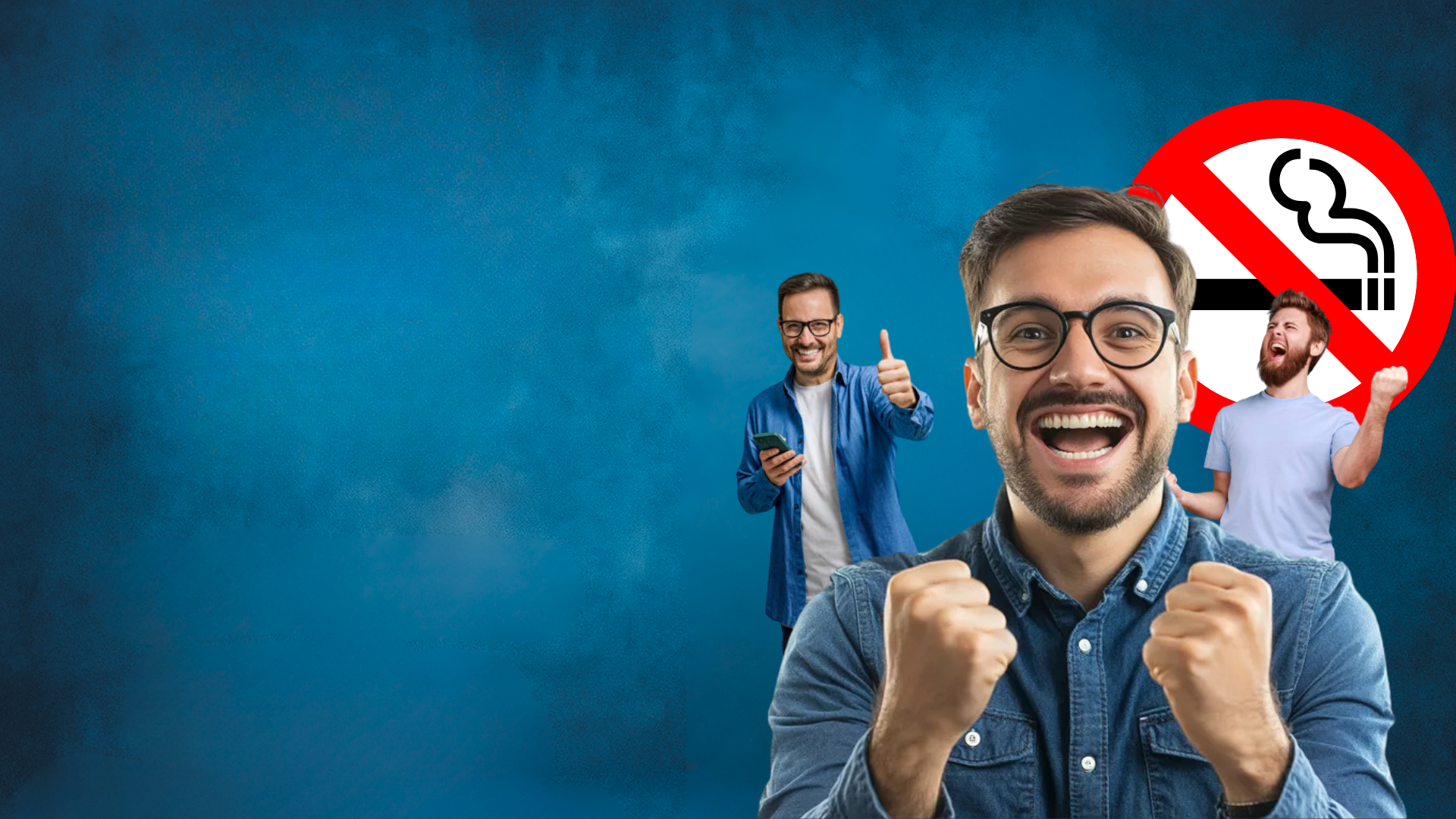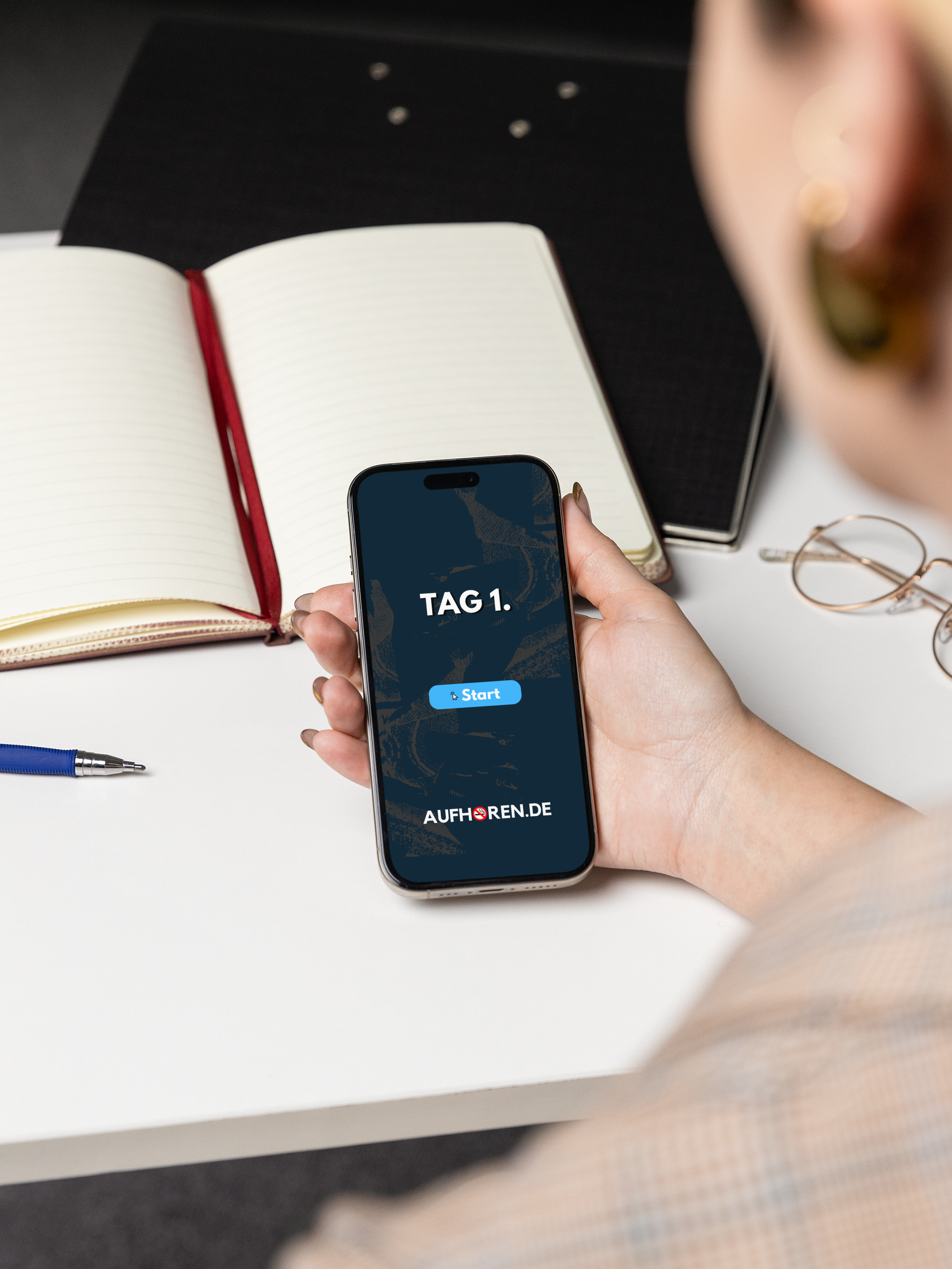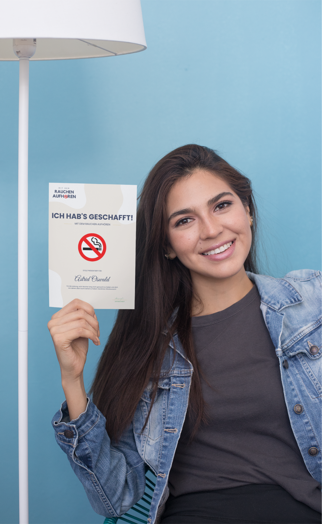 Das Kleingedruckte? Mit „aufhören” meinen wir, dass du mindestens 50 % weniger rauchst als vor dem Programm. Beispiel: Du hast 15 Zigaretten pro Tag geraucht und am Ende des Programms noch 7.